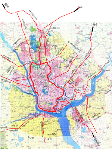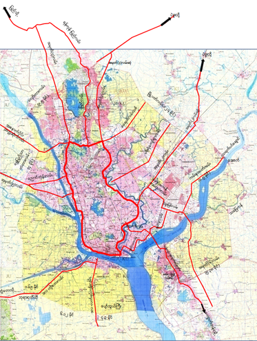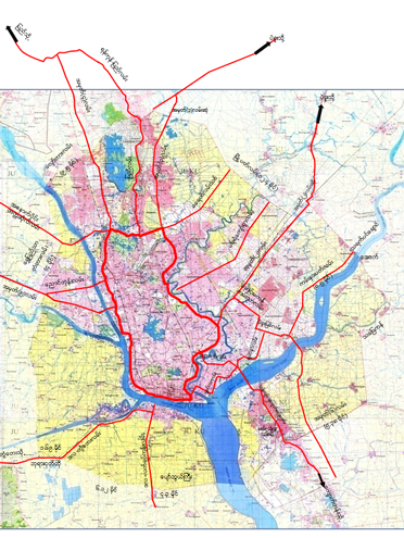 ၈ မိုင်လမ်းဆုံမှ ပြည်လမ်းအတိုင်း လှည်းတန်း၊ မြေနီကုန်း၊ ပြည်လမ်းနှင့် ဗိုလ်ချုပ်လမ်းဆုံ၊ ၎င်းမှ ဗိုလ်ချုပ်လမ်းအတိုင်း ဆူးလေဘုရားလမ်းအထိလည်းကောင်း၊ ဆူးလေဘုရားလမ်းနှင့် ဂျိုးဖြူလမ်း၊ ကမ္ဘာအေး ဘုရားလမ်းအတိုင်း ၈ မိုင်လမ်းဆုံအထိ Counter Clockwise Direction အတိုင်း လည်းကောင်း-