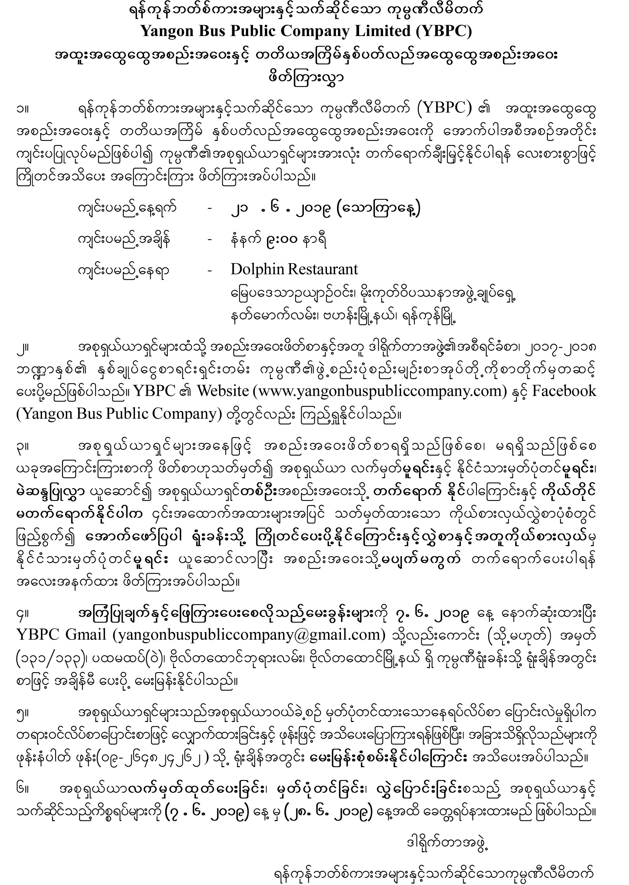 ၁။ ရန်ကုန်ဘတ်စ်ကားအများနှင့်သက်ဆိုင်သောကုမ္ပဏီလီမိတက်သည် ရန်ကုန်မြို့တွင် ခရီးသွားလာမှုအဆင်ပြေစေရေးအတွက် ခရီးသည်တင်ယာဉ် City Bus များပြေးဆွဲရန် အမျိုးအစားကောင်းမွန်သောပြည်ပနိုင်ငံထုတ်မော်တော်ယာဉ်များကို ၀ယ်ယူရန် အလိုရှိပါသဖြင့် တင်ဒါပေးသွင်းလိုသောမြန်မာနိုင်ငံသားများပိုင် ကုမ္ပဏီလုပ်ငန်းရှင်မျ