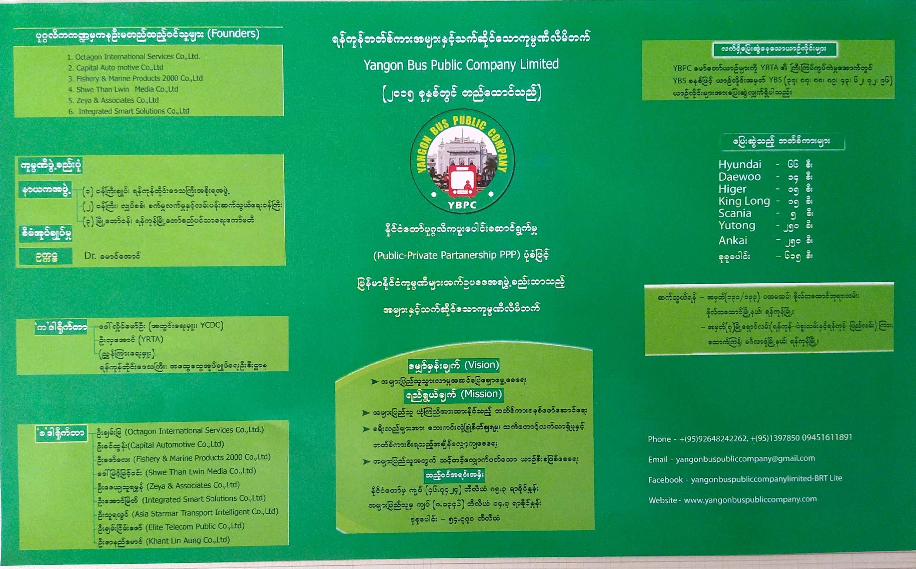 ရန်ကုန်ဘတ်စ်ကားအများနှင့်သက်ဆိုင်သောကုမ္ပဏီလီမိတက်သည် ရန်ကုန်မြို့တော်နေ ခရီးသွားပြည်သူများ သွားလာမှု လွယ်ကူ အဆင်ပြေစေရေးအတွက် BRT Lite စနစ်ဖြင့် နောက်ဆုံးပေါ် City Bus အဆင့်မြင့် မော်တော်ယာဉ်များဖြင့် ခရီးသည် ပို့ဆောင်ရေးလုပ်ငန်းကို စျေးနှုန်းအထူးချိုသာစွာ ပြေးဆွဲပေးလျက်ရှိပါသည်။ နိုင်ငံတကာအဆင့